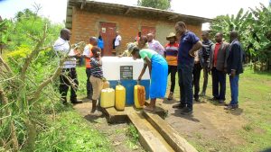 Leaders look on as community members use newly constructed water point. Kabarole District, Uganda. 30 September 2025