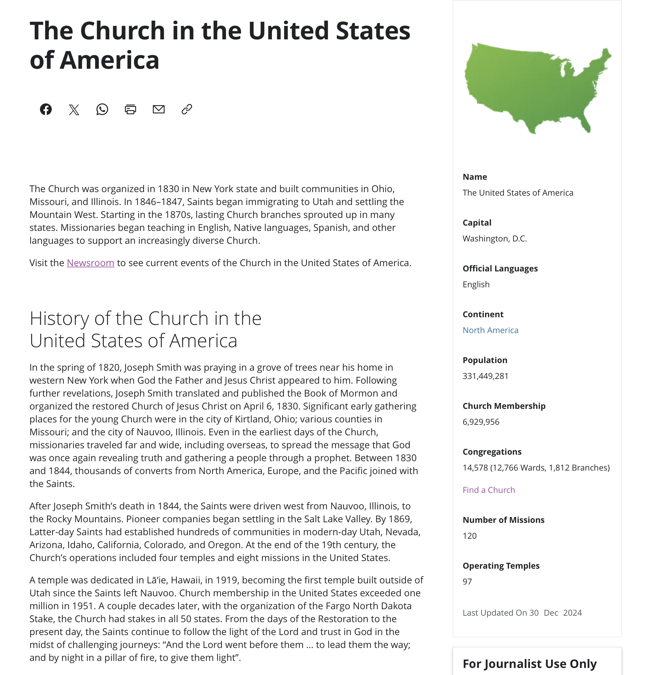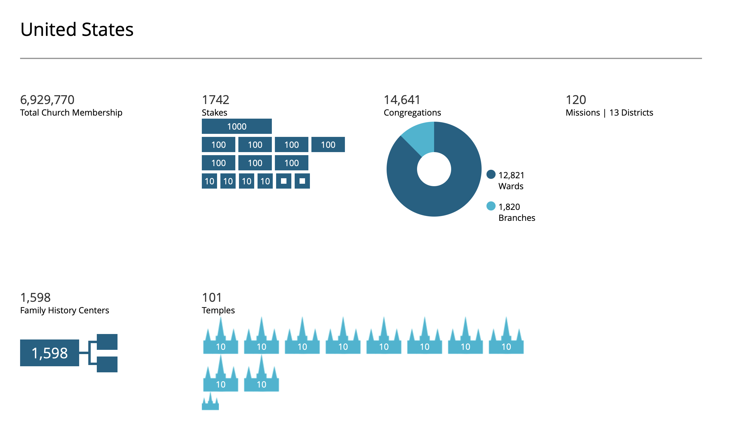 The United States remains the country with the largest population of members of The Church of Jesus Christ of Latter-day Saints. The latest figures list 14,641 congregations nationwide, including 12,821 wards and 1,820 branches. The country also has 1,598 family history centers, 101 operating temples and 120 missions organized across 13 districts.